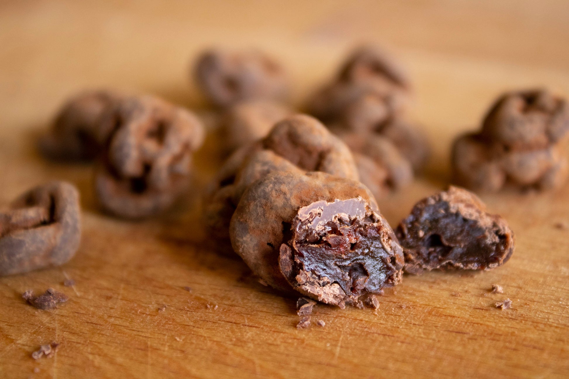 These rustic treats are all made with locally grown nuts and fruit. Coated in either dark or milk chocolate from our own factory, then lightly dusted with cocoa powder for a natural, matte finish. Great for snacking or as an addition to a gourmet trail mix.